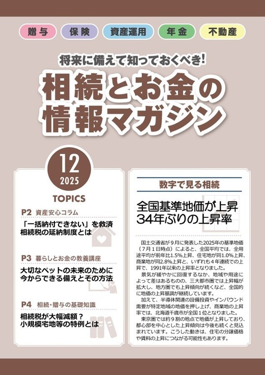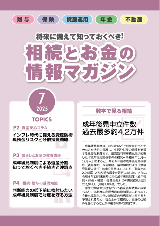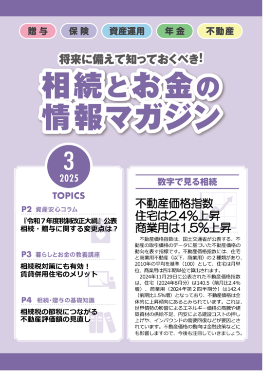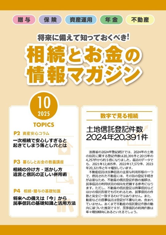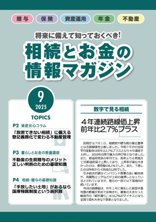 ここで公開している「相続とお金の情報マガジン」は、情報の正確性を確保し、定期的にお客様に最新情報をお届けするため、当事務所が専門のコンサルタント会社から記事を毎月購入し、利用規約に従って公開しているものです。