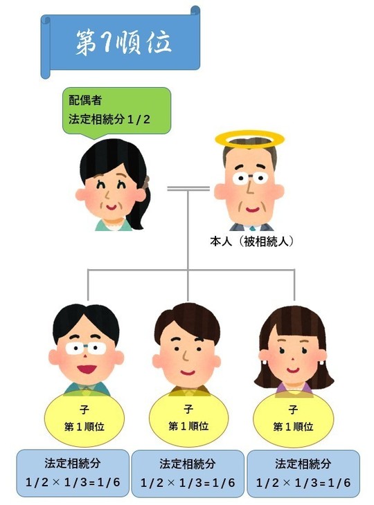 故人の配偶者は必ず相続人となり、そのほかの法定相続人は、配偶者とともに次の順位で相続人となります。(先順位がいるときは、後順位は相続人になりません。)